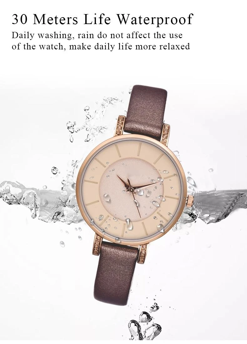 Leather OEM Brand Your Own Women's Watches Trendy Wristwatches Fancy Business Ladies Watches1. imported Japan quartz os 11 movement and battery: provide accurate time to hold, the watch will serve for more than 3 years2.High hardness mineral glass dial: bump-proof and key scratch-resistant3.Comfortable: appropriate watch weight, high-quality steel watch band and smooth steel band surface, all these make this watch super comfortable to wear4.Simple and elegant design: Simple and luxurious dial with calendar, 30 M waterproof perfect for everyday use5. 3 ATM / 30 M Waterproof (Support Cold Shower and Swimming, do not operate clock when underwater, does not support hot water);Product parameters